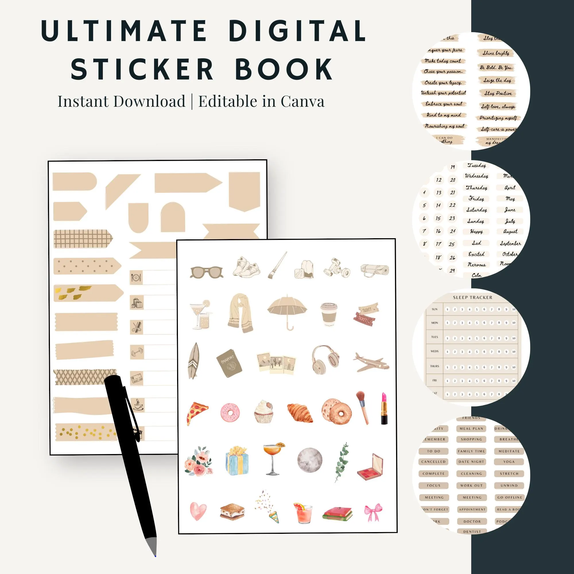 ✅ A fully editable 58-page hyperlinked sticker book in Canva (ready to use or export to Goodnotes)