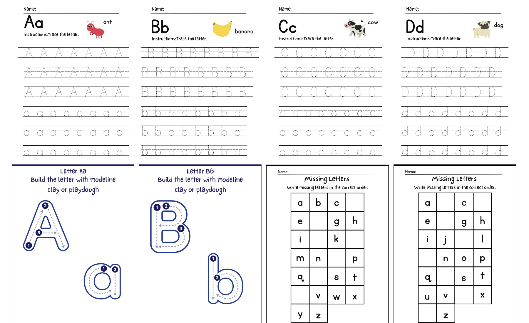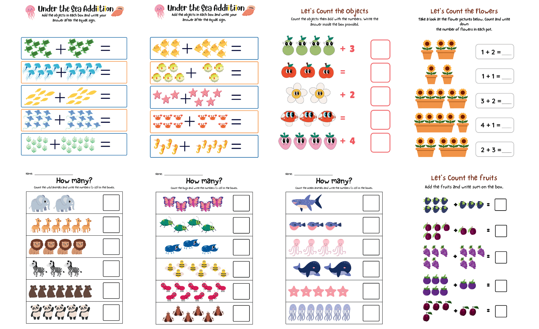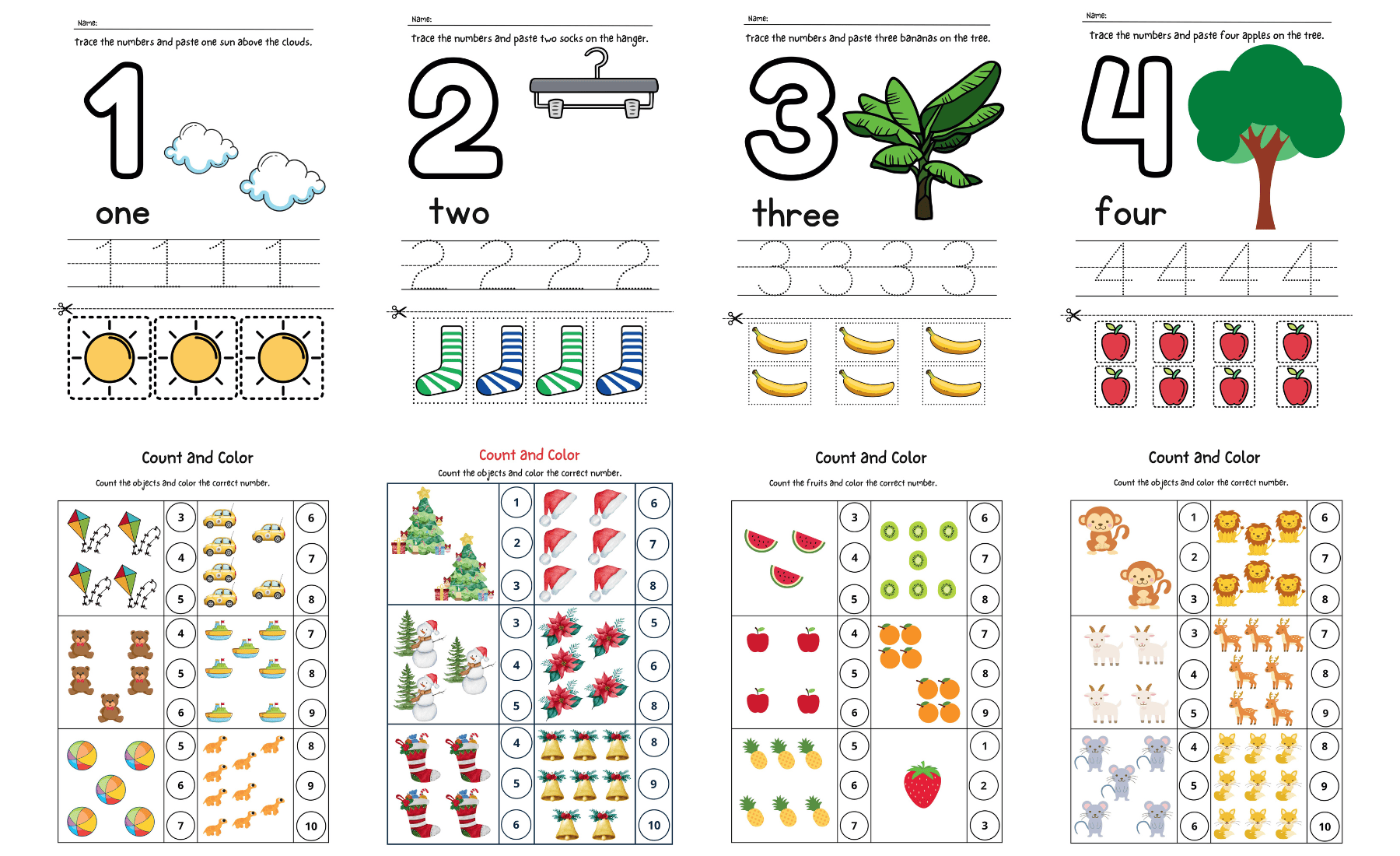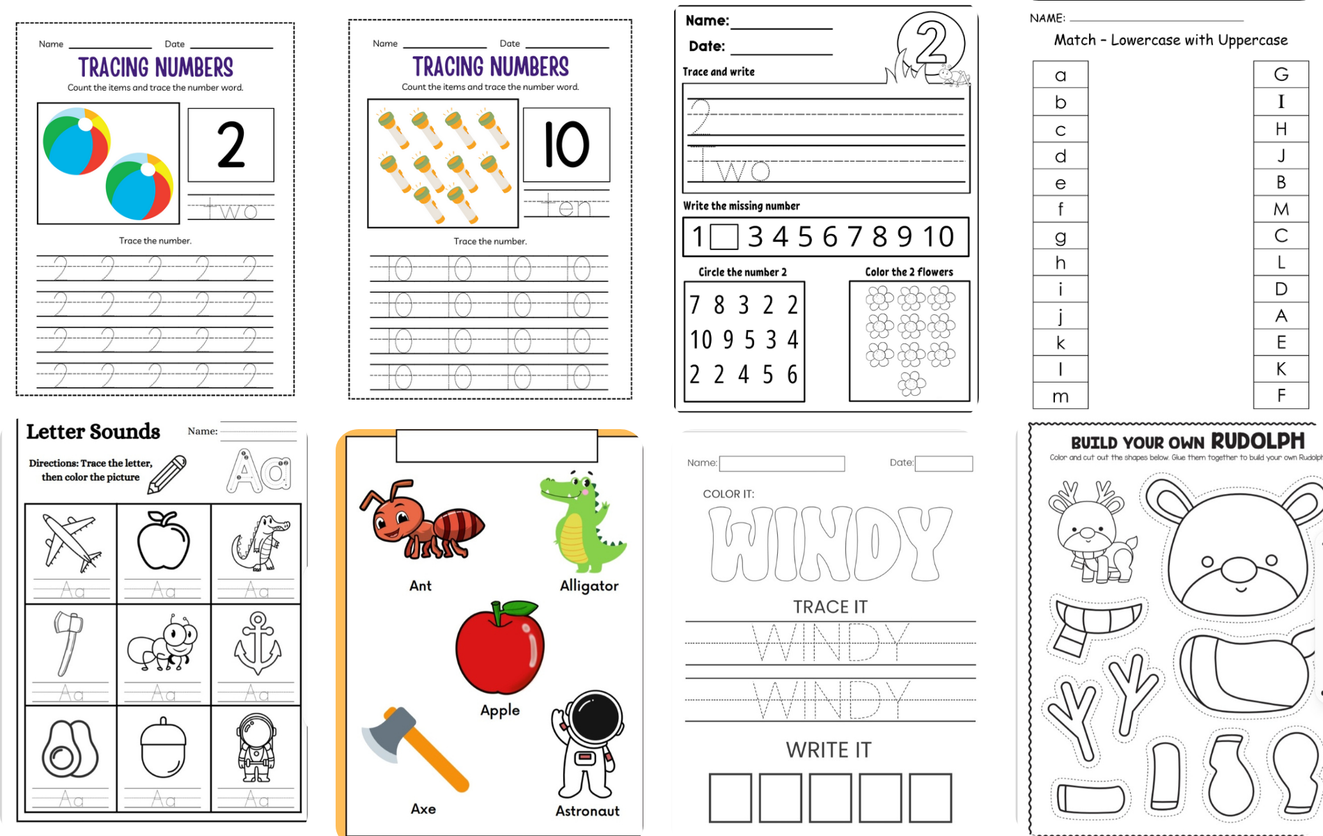 Engaging pages for letter recognition, phonics, counting, and early math.