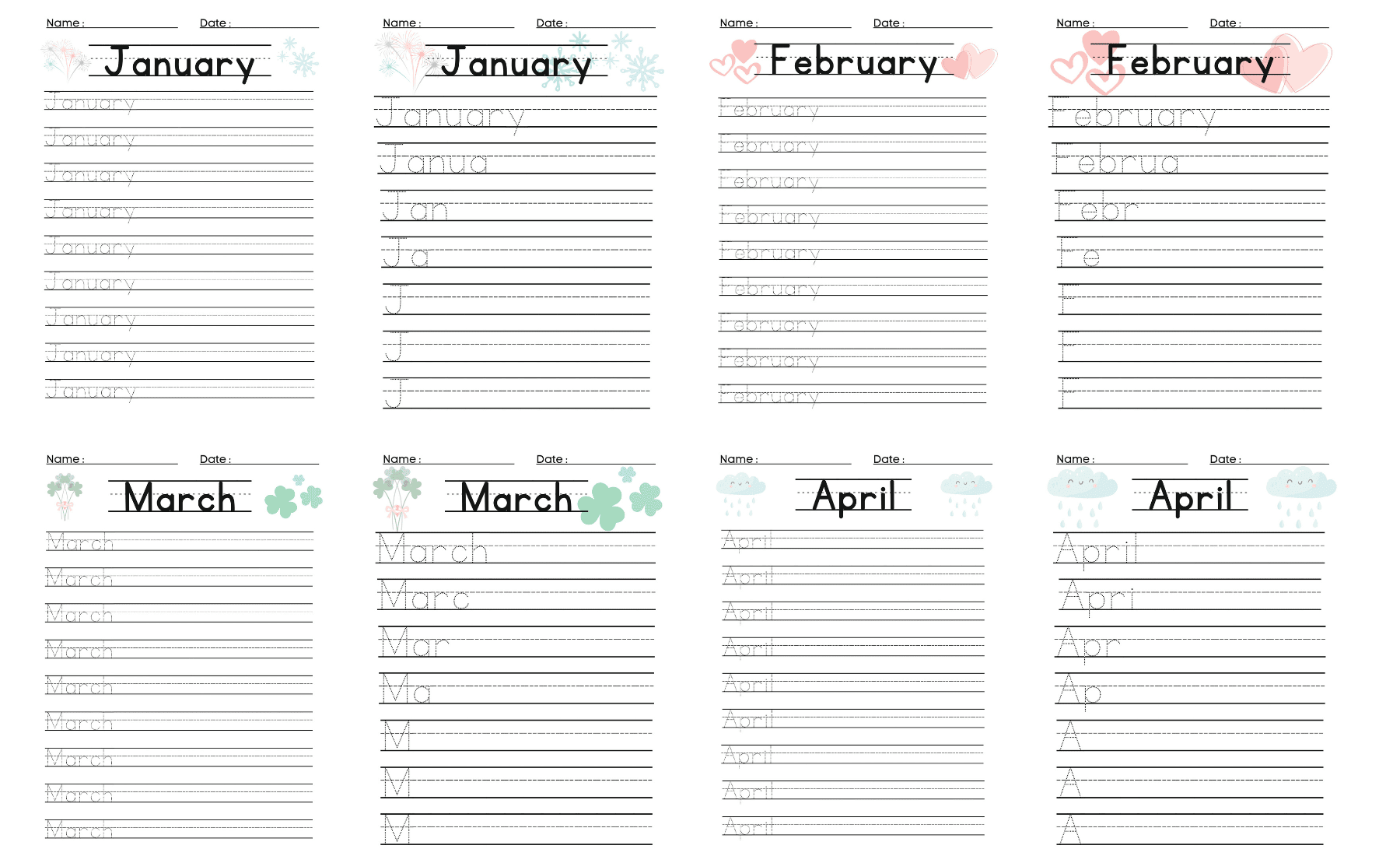 Clock-reading practice, weather charts, calendar skills, and responsibility trackers.